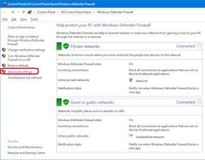 - (Firewall setup) Go to "Windows Defender Firewall" and click on "Advanced settings" on the left